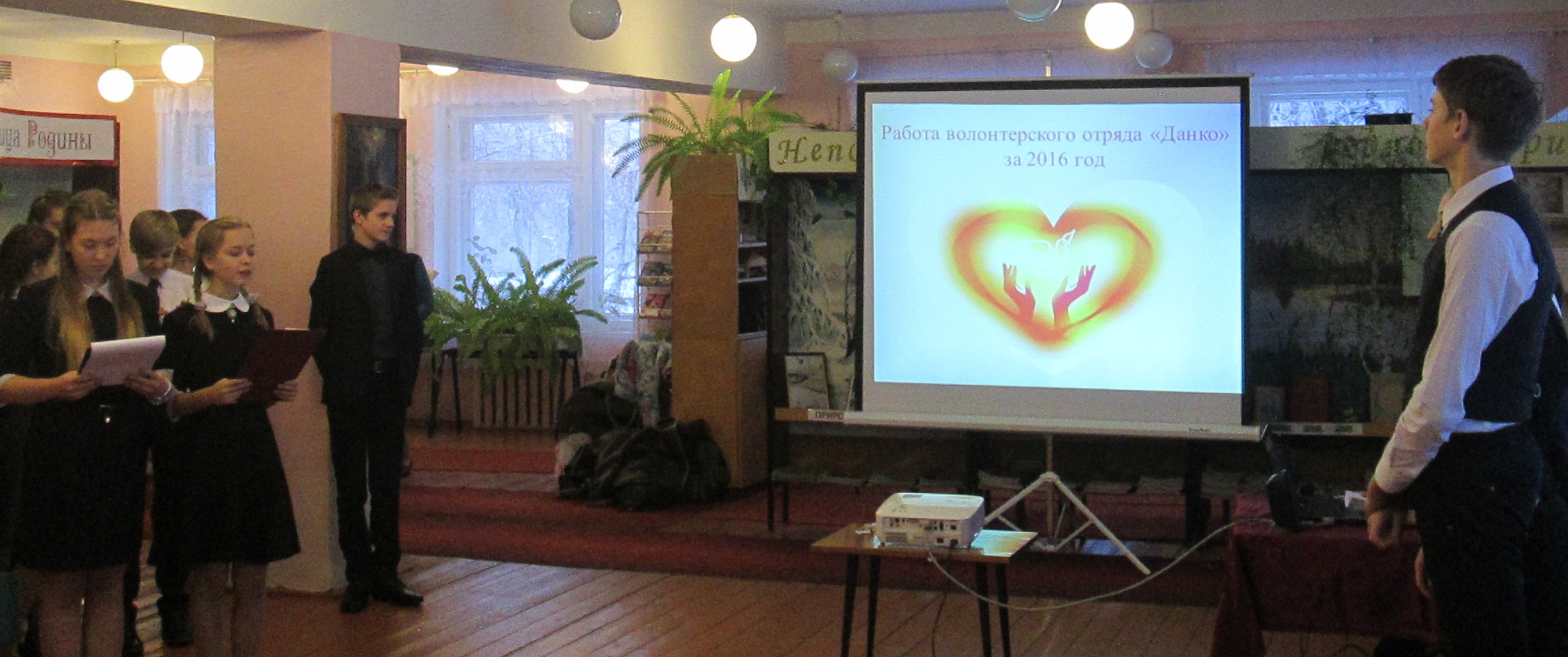 Цель мероприятия: привлечение внимания общественности к теме волонтёрства, популяризация молодёжного добровольчества путём презентации лучших практик, формирование единения всех участников волонтёрского сообщества. В рамках мероприятия прошло торжественное посвящение в волонтёры новых добровольцев из числа обучающихся 8 класса Марёвской средней школы (классный руководитель: Корнилов П.П.) С презентацией своей деятельности перед восьмиклассниками выступили волонтёры отряда «Данко», обучающиеся 9-го класса Марёвской средней школы, представители волонтёрского формирования «Пламя»- десятиклассники Жуков Иван, Пожарнов Алексей. В течение года волонтёры сотрудничали со многими учреждениями района. За проделанную работу в 2016 году волонтёрские отряды «Данко», «Пламя», «Волна» отмечены - Дипломами Отдела образования социального комитета Администрации Марёвского муниципального района, -Благодарственным письмом Председателя Марёвского районного совета ветеранов Новгородской области общественной организации ветеранов (пенсионеров) войны, труда, Вооружённых Сил и правоохранительных органов, -Благодарственным письмом детского отделения районной библиотеки МУК «Централизованная библиотечная система». Благодарим волонтёров школы и их классных руководителей Иванову Зою Степановну, Шаповалову Ирину Геннадьевну, Касаткину Татьяну Александровну, Агафонову Ольгу Фёдоровну, Рекечинского Илью Андреевича за самоотверженный труд, желание изменить мир к лучшему. Желаем творческих успехов в реализации новых социальных проектов.